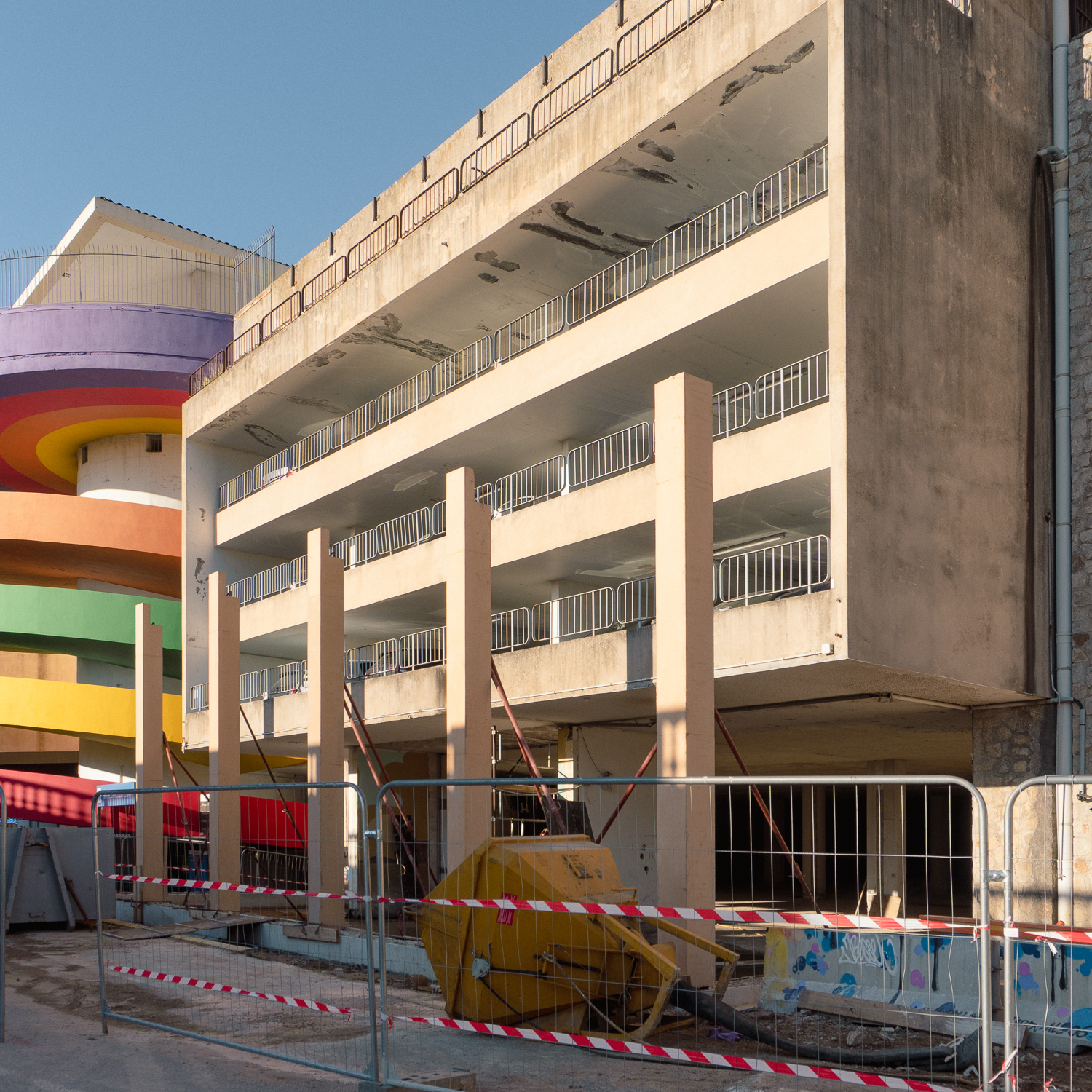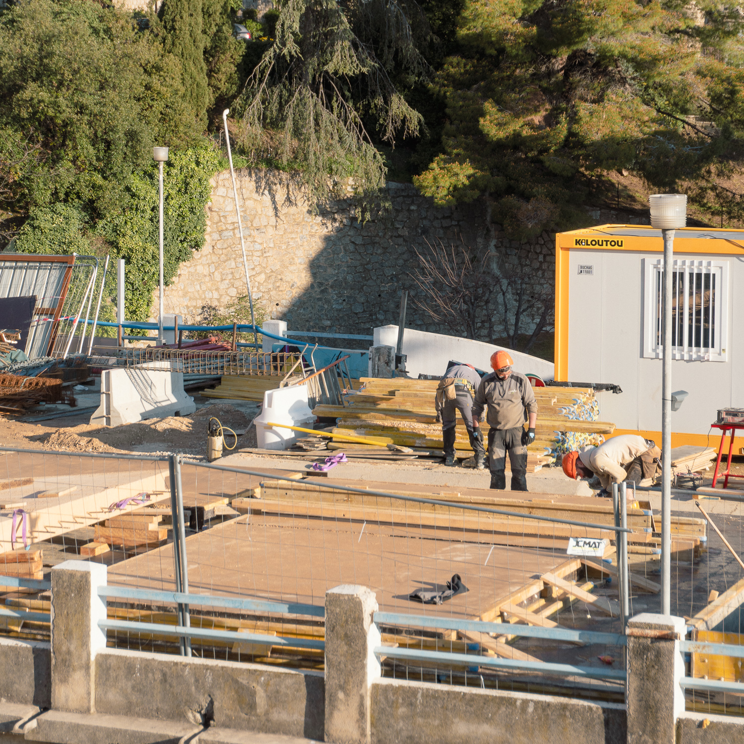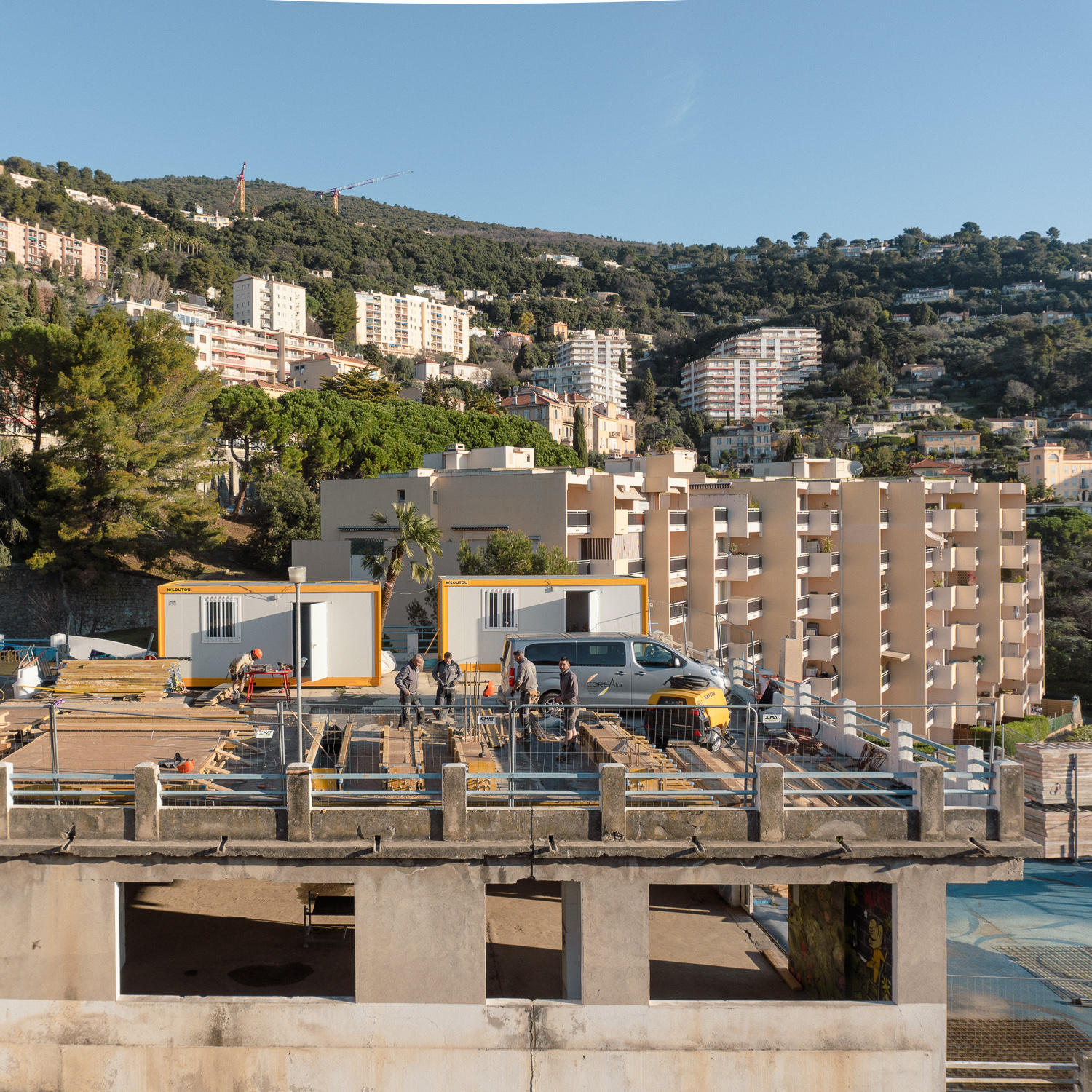 Le chantier de la première phase du projet (parking Notre-Dame-des-Fleurs) a démarré en décembre dernier avec le début du curage des espaces qui seront dédiés à la future installation d'un commerce de proximité, et la réalisation d'éléments de renforcement structurel. L'exécution est l'occasion d'affiner les hypothèses de projet avec les savoir-faire des entreprises, notamment les cannelures des linteaux béton.