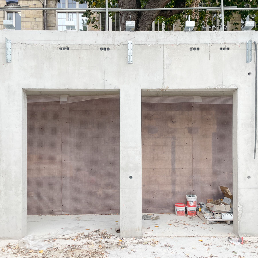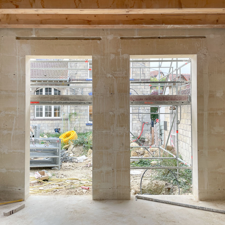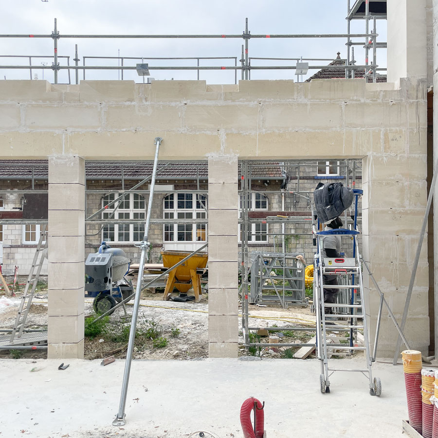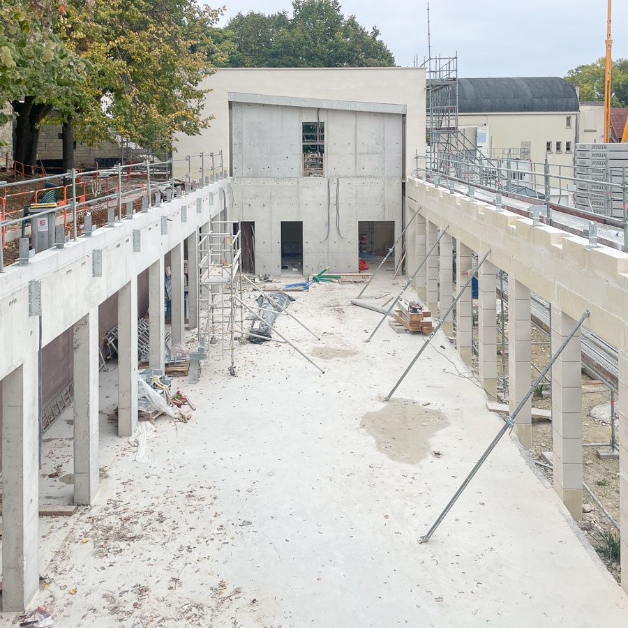 Le chantier de réhabilitation et extension de la mairie de Conflans-Sainte-Honorine avance: restructuration du pavillon oriental du bâtiment A avec mise en place de la future entrée et réalisation d'un escalier + ascenseur, restitution de murs en pierre abattus au XXe siècle, coulage des fondations d'une première galerie de liaison, coulage de la dalle de la salle du conseil, prototype en cours avec calepinage des futurs murs en pierre massive de l'extension.