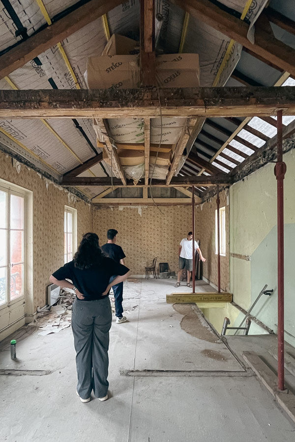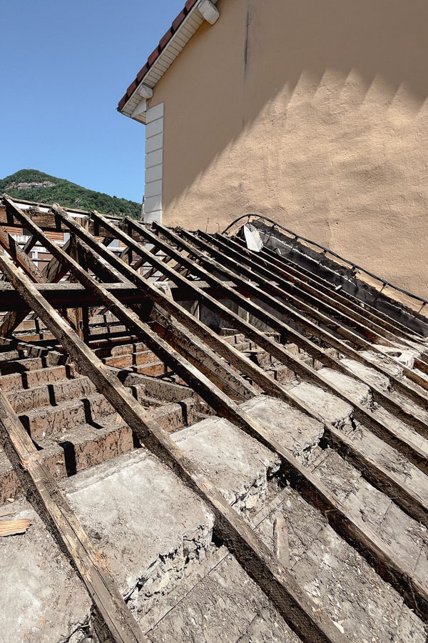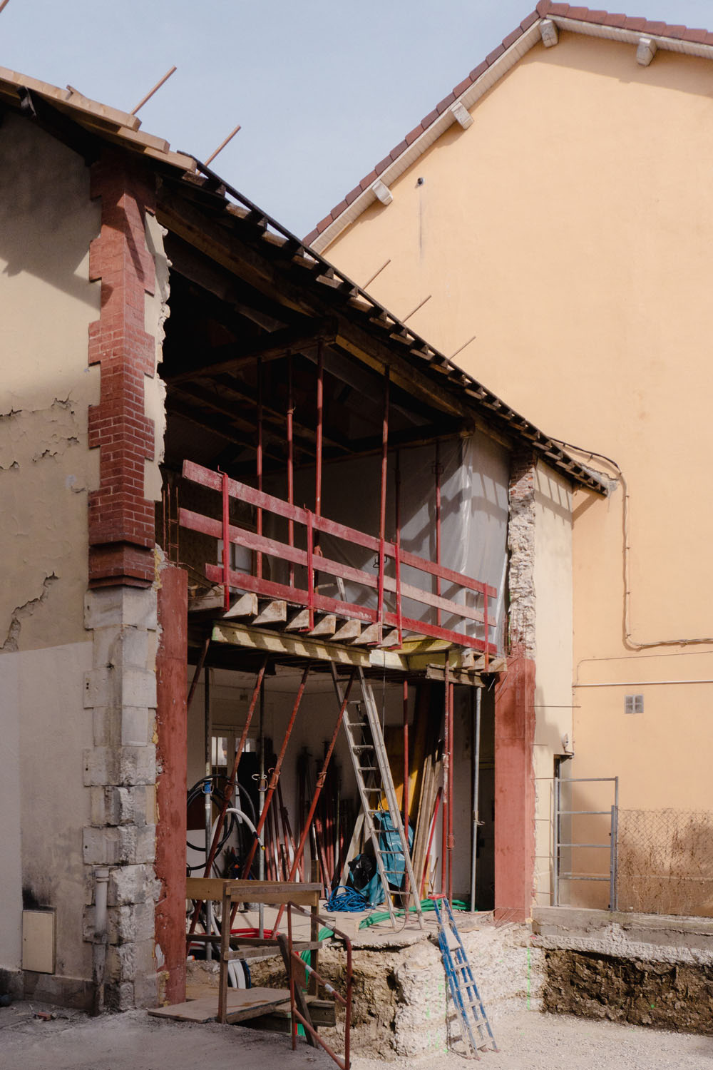 Le chantier de réhabilitation et extension de la Maison du Combattant de Voiron, futur atelier isérois, a débuté par la resuivi de la toiture et sa consolidation, puis la dépose du mur maçonné de la façade méridionale pour y accueillir la greffe de la future extension.