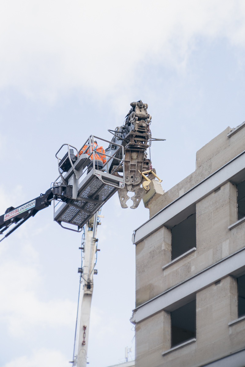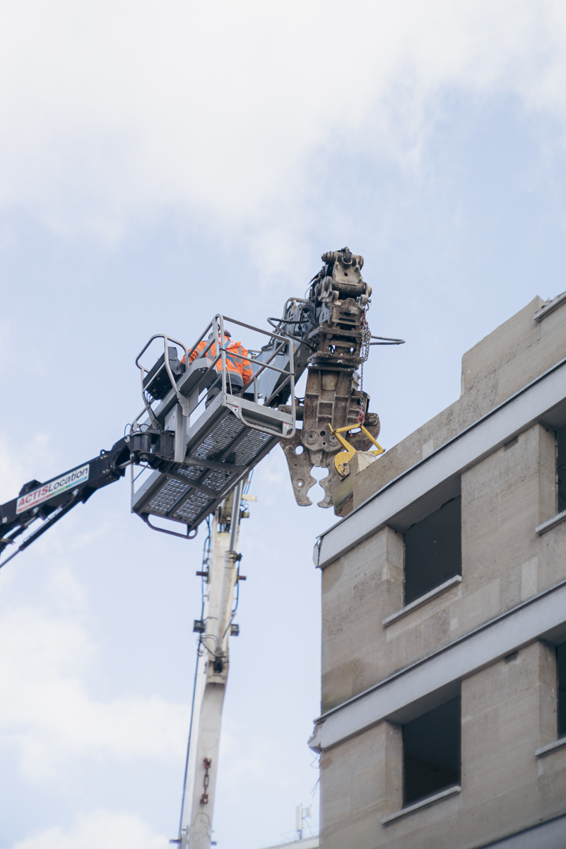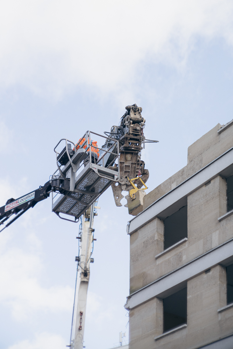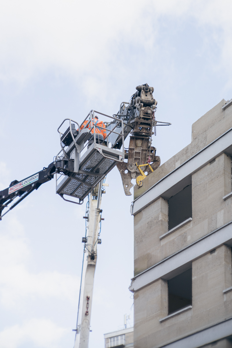 La dépose des pierres continue, impliquant un tri précis des différents blocs extrait de la carrière que représente la partie démolie de la barre.