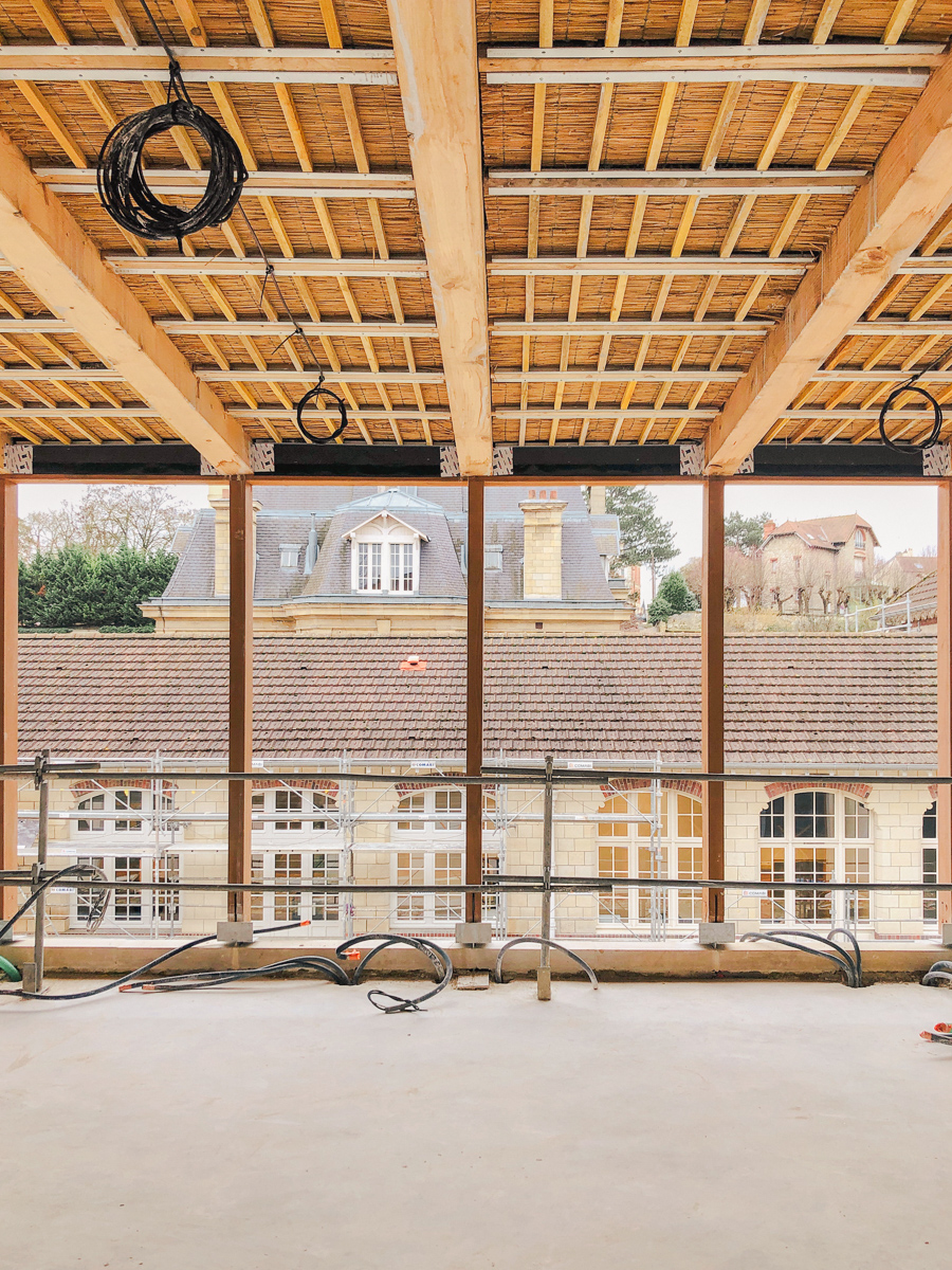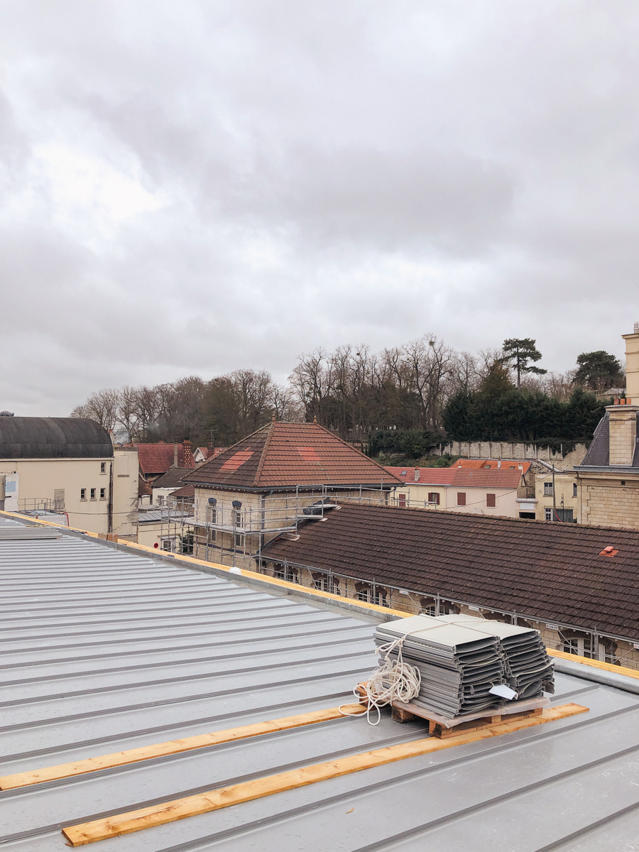 Le chantier de réhabilitation et extension de la mairie de Conflans Sainte Honorine suit son cours avec la fin de la réalisation de l'isolation de la toiture en béton de chanvre et le début de la pose de la couverture sur le corps central. Les menuiseries extérieures sont progressivement posées en applique intérieure sur les murs en pierre massive, avant de débuter la réalisation du mur à ossature bois de l'étage.