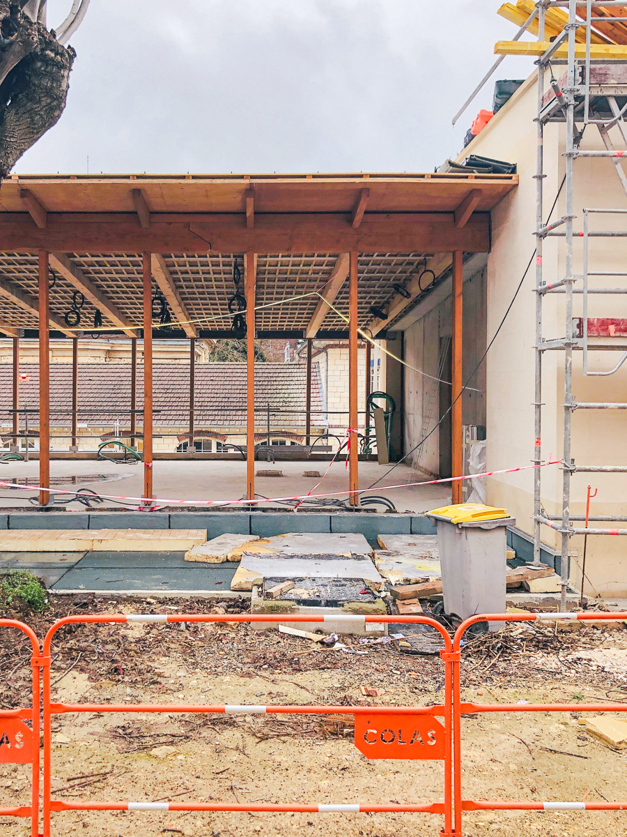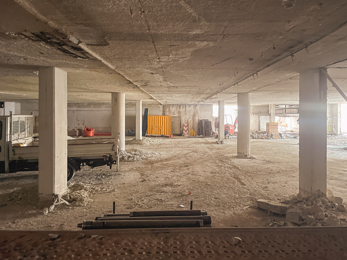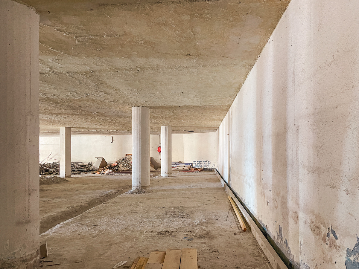 Le chantier de la première phase du projet (parking Notre-Dame-des-Fleurs) a démarré en décembre dernier avec le début du curage des espaces qui seront dédiés à la future installation d'un commerce de proximité, et la réalisation d'éléments de renforcement structurel. L'exécution est l'occasion d'affiner les hypothèses de projet avec les savoir-faire des entreprises, notamment les cannelures des linteaux béton.