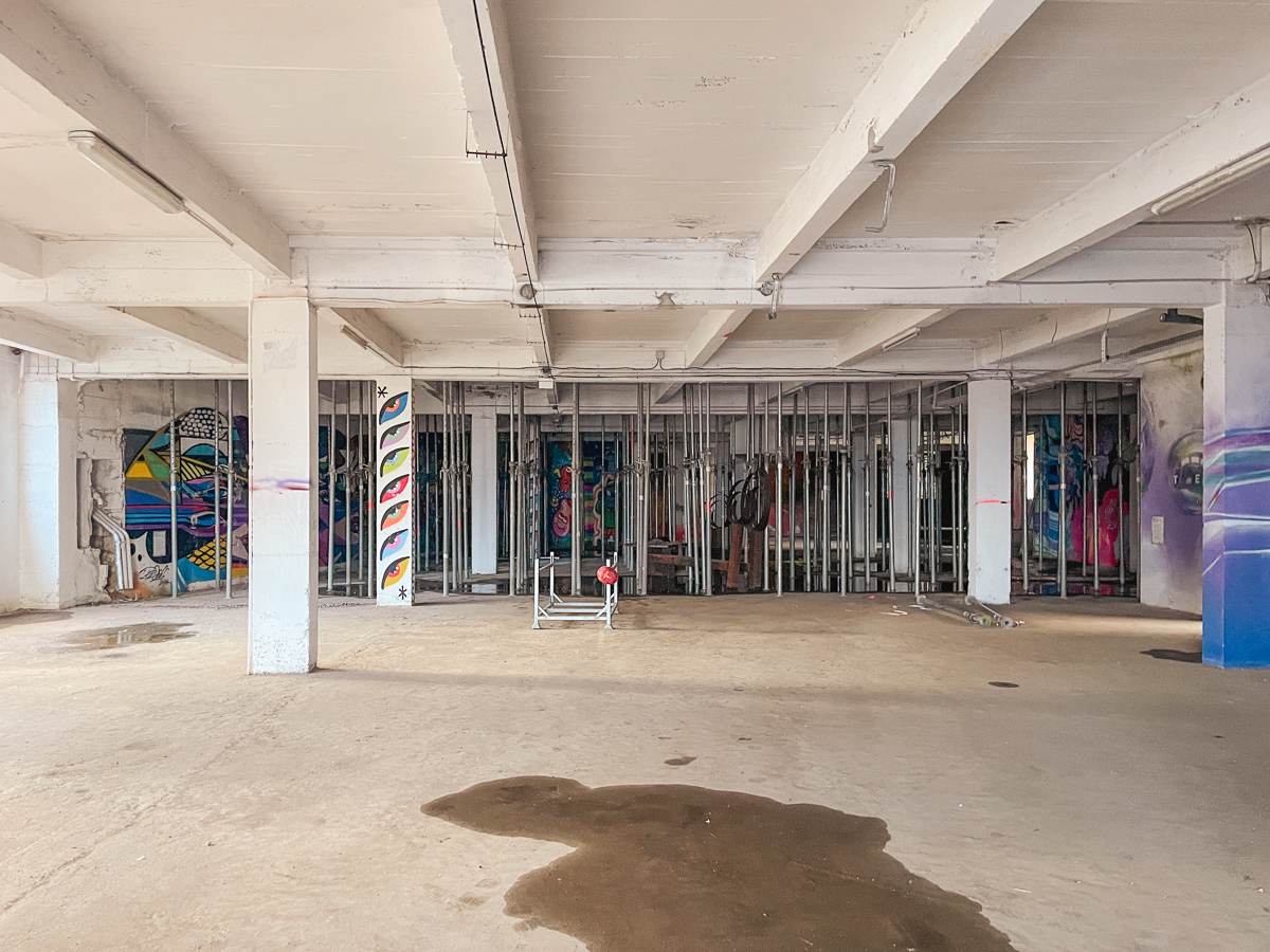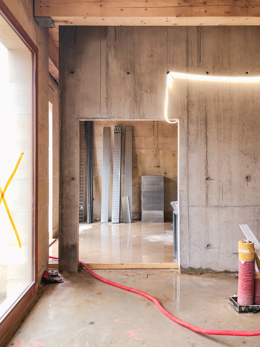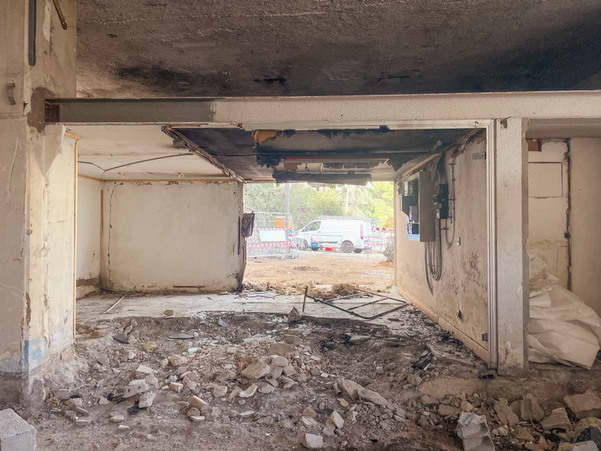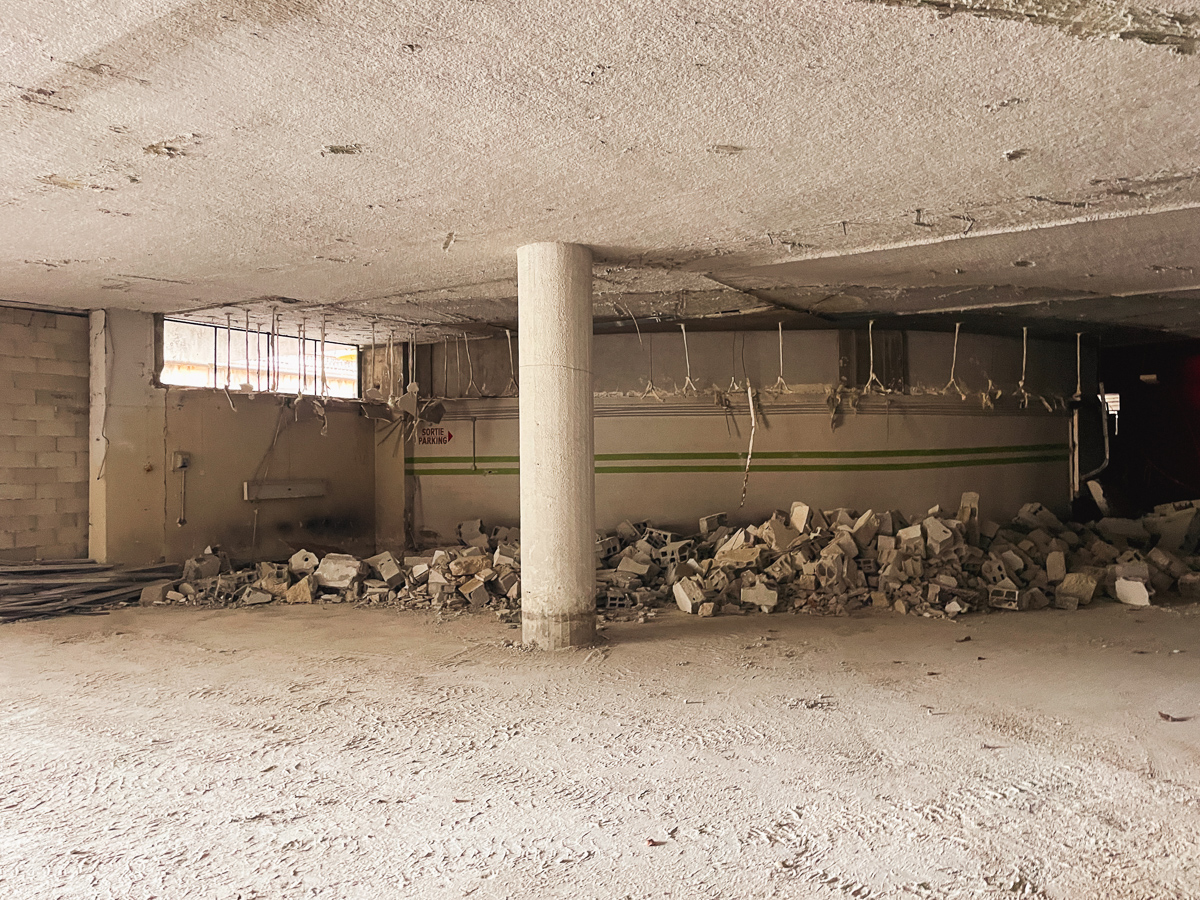 Le chantier de la première phase du projet (parking Notre-Dame-des-Fleurs) a démarré en décembre dernier avec le début du curage des espaces qui seront dédiés à la future installation d'un commerce de proximité, et la réalisation d'éléments de renforcement structurel. L'exécution est l'occasion d'affiner les hypothèses de projet avec les savoir-faire des entreprises, notamment les cannelures des linteaux béton.